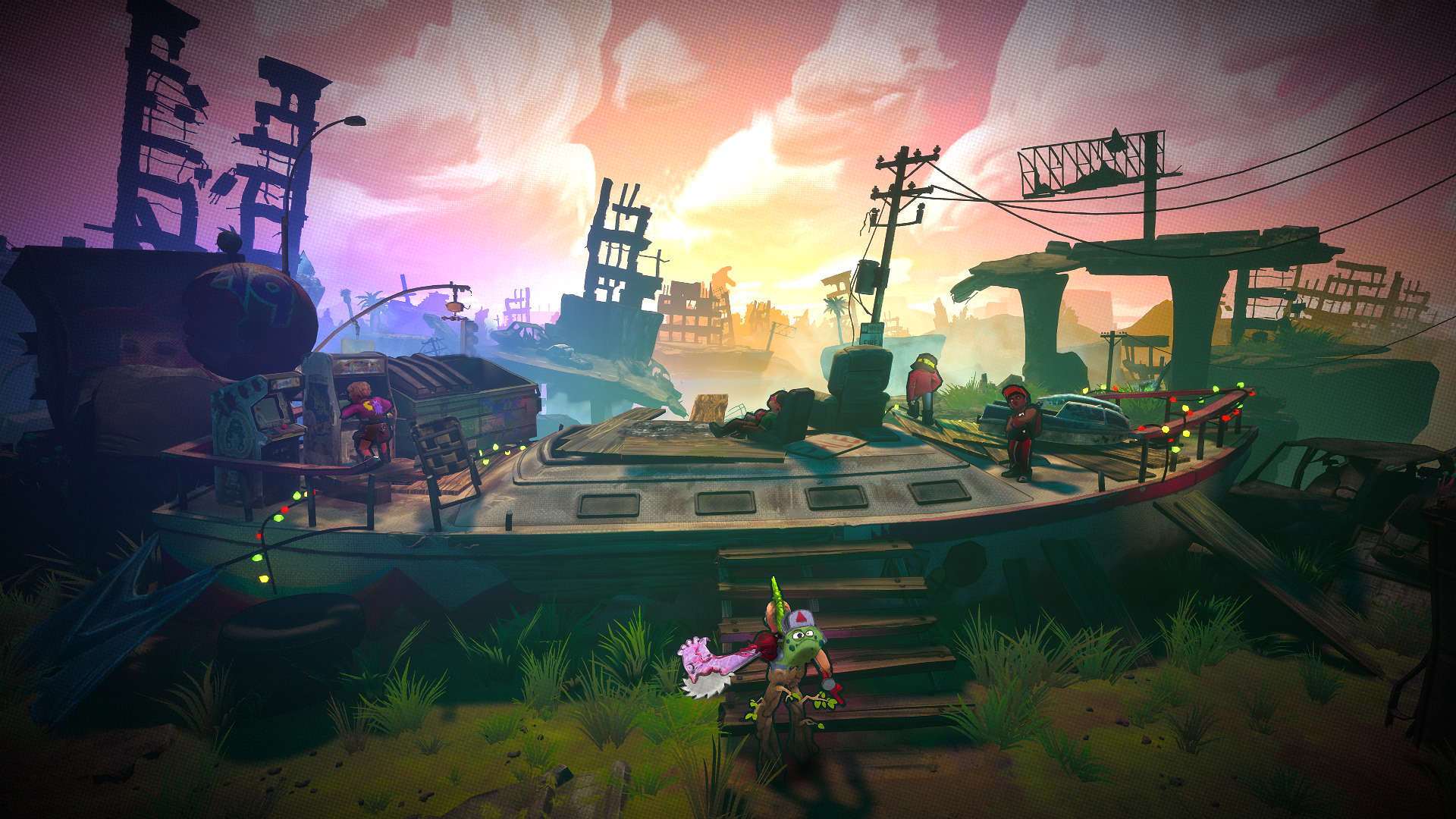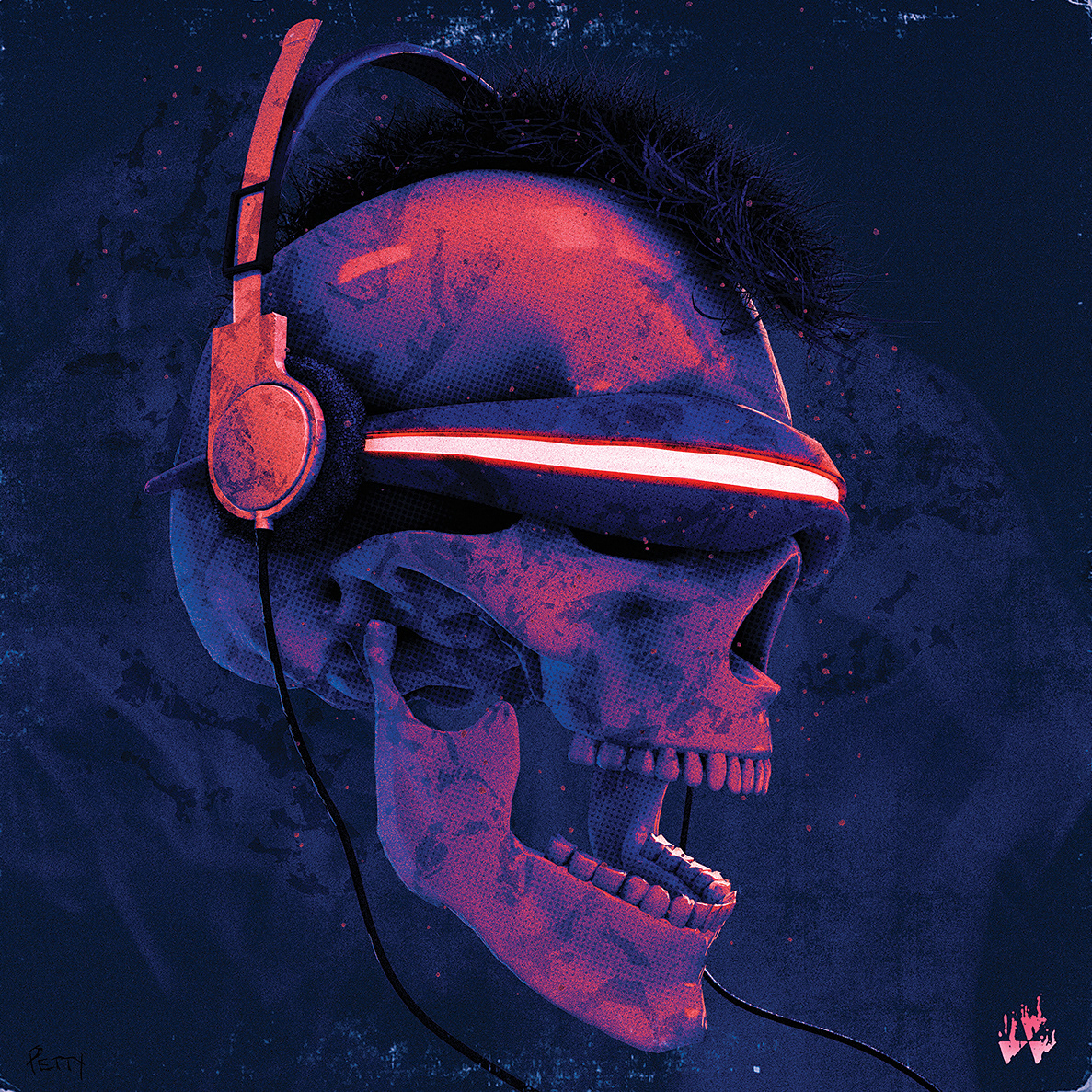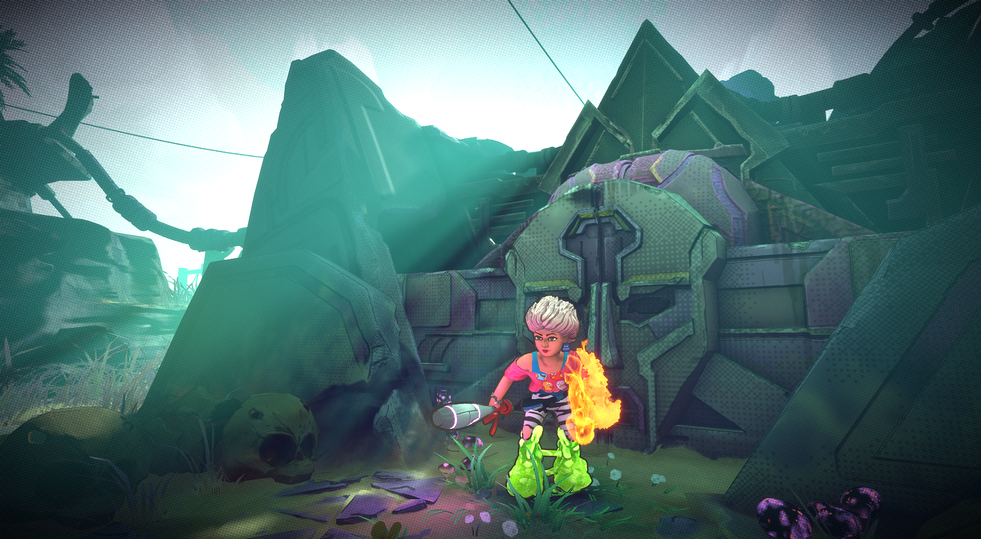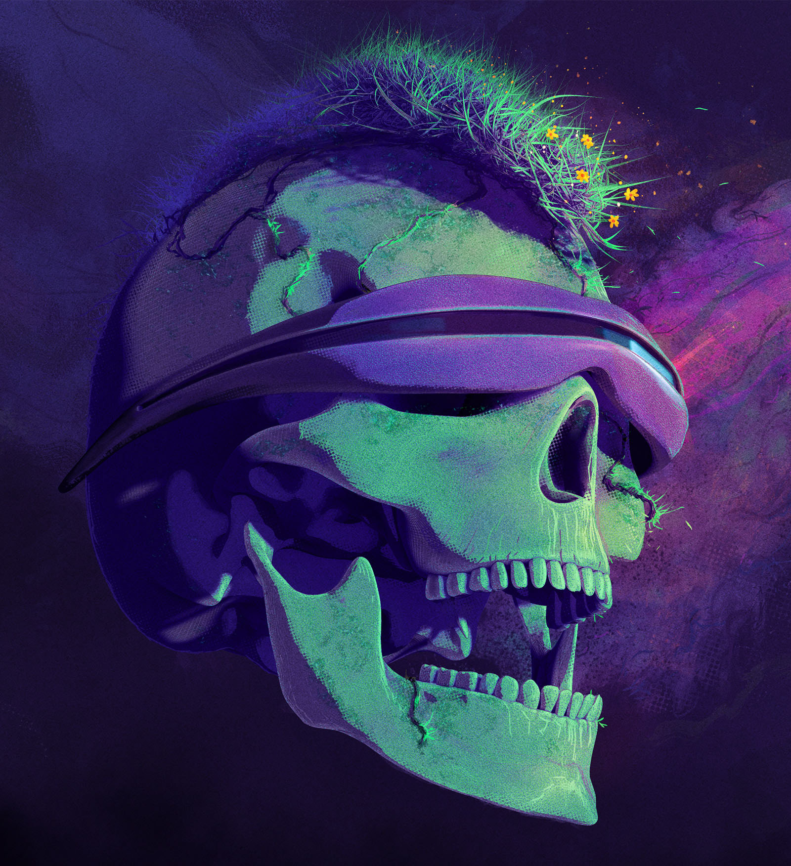 I created the "Rad Skull" image for the Main Menu in the game and it was also used in marketing-related art. The skull has a Mohawk made of grass because the player character grows new life as they make their way through the wasteland.